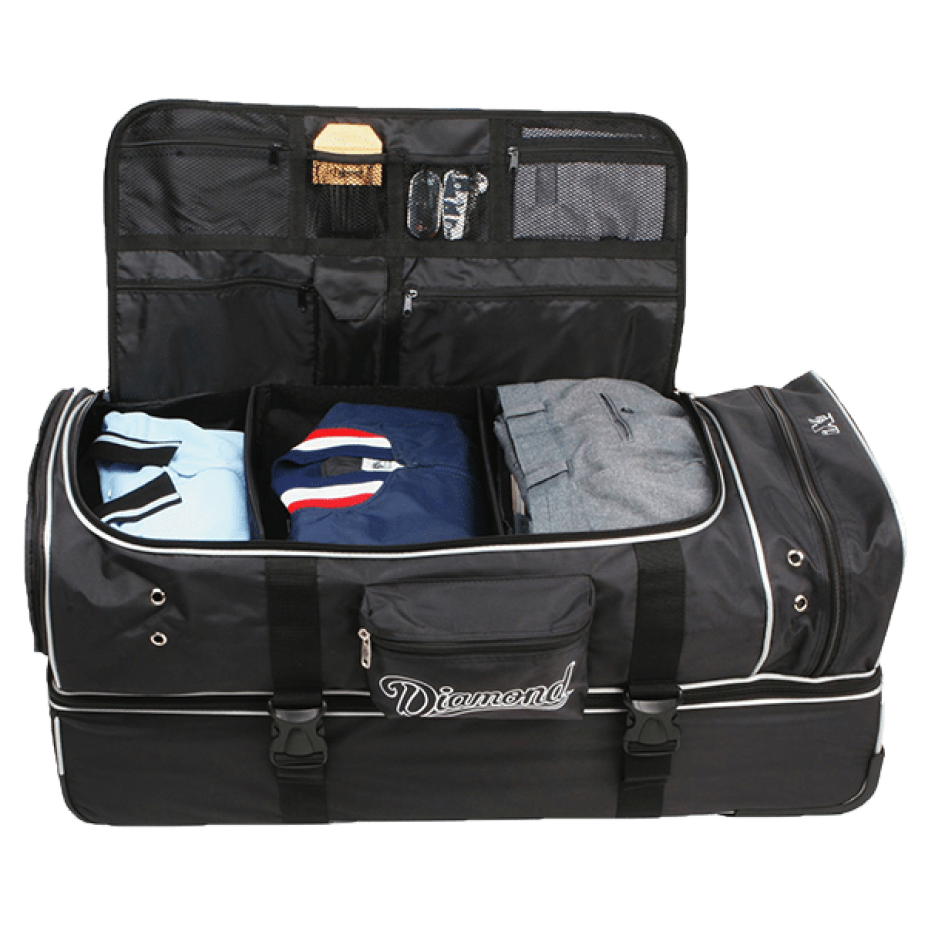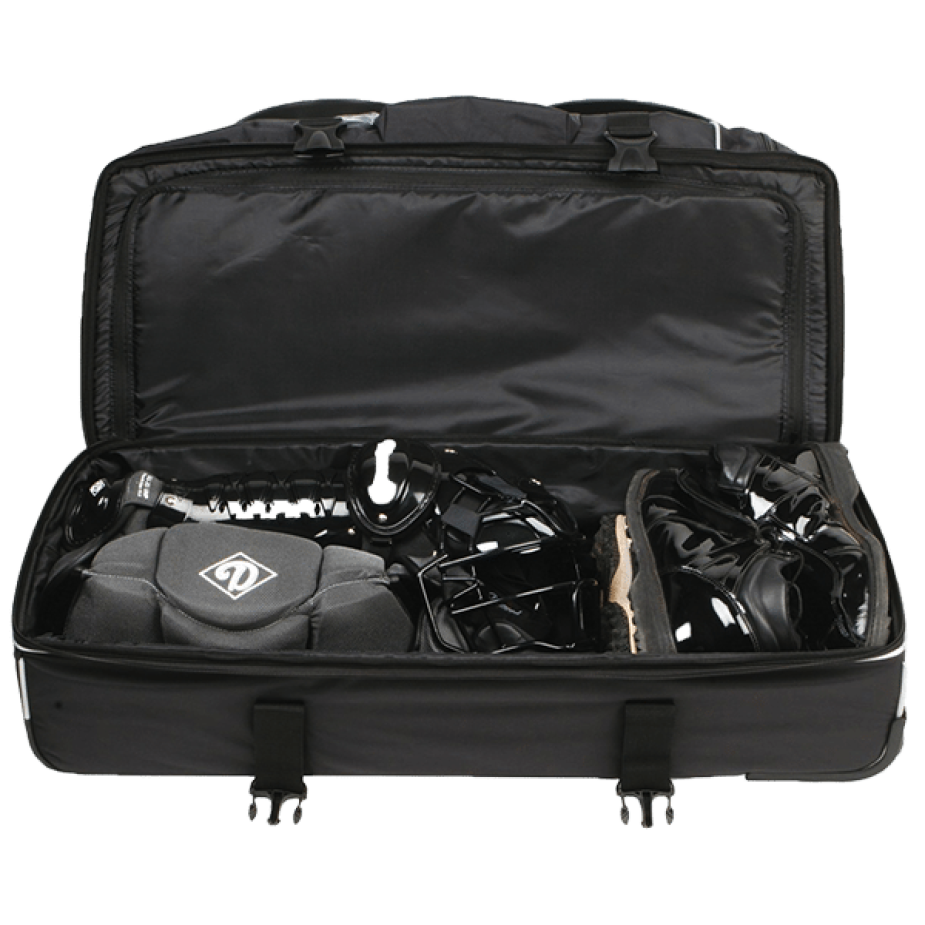 The Diamond Deluxe Pro Umpire Gear Bag is made of durable, ballistic type 1680-denier fabric. Separate compartments for your gear and clothes provides ample room to store all of your umpire equipment. A telescopic pull handle on the bag and durable wheels make transpiration easy and convenient.
