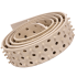 When putting on the “Hidden Tailor”, stretch it about one inch. The outside of belt has small nubs to help hold your slacks in place. Designed to lay flat with the nubs out , the belt is buttoned through any of the center holes with the large head of the button inside. Can be cut to fit any size.