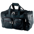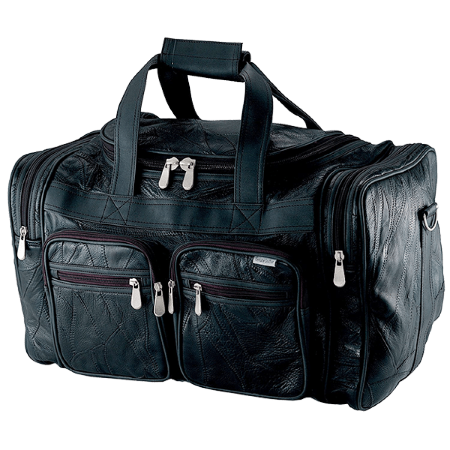 Soft, yet strong, buttery black leather with double handles and a detachable shoulder strap. Lined interior and reinforced bottom with feet. Main compartment, two zippered end compartments and two front compartments with two zippers each. Measure 19” x 11.5” x 12”.